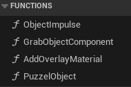 The blueprint function library included four functions related to the telekinesis mechanic. I organized the functions in this library to ensure that I could easily call them later in other blueprints. This also helped reduce the overall size of the blueprint graphs by minimizing the space taken up by having functions.