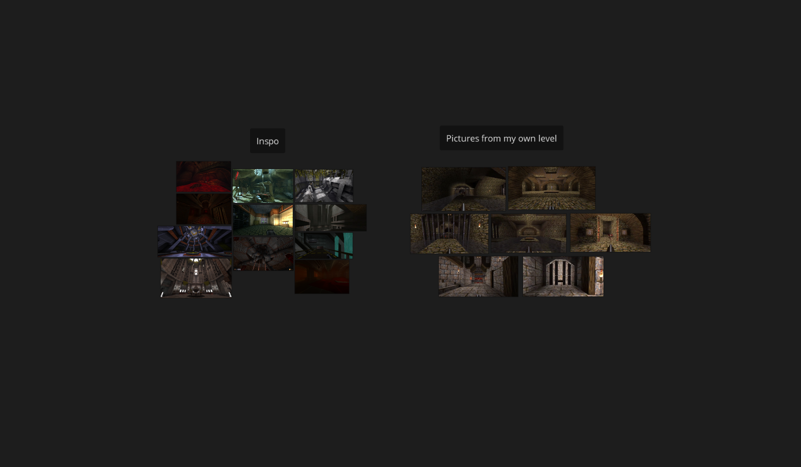 For this project, I began by reviewing my previous level to draw inspiration from it. I gathered reference images from my old level as well as from other Quake levels and games that featured environments similar to what I envisioned. Then, I created a mind map with bubbles to outline the basic flow of the level.